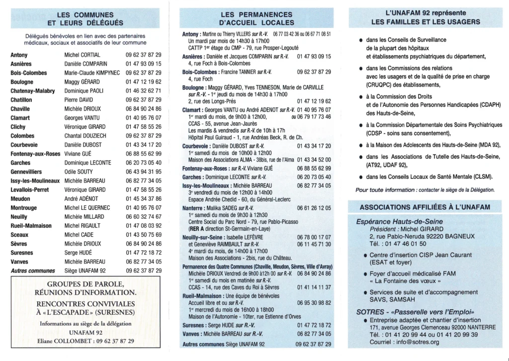Informations par des psychiatres, psychologues, avocats, assistantes sociales, notaires, et bénévoles formés et disponibles ;
